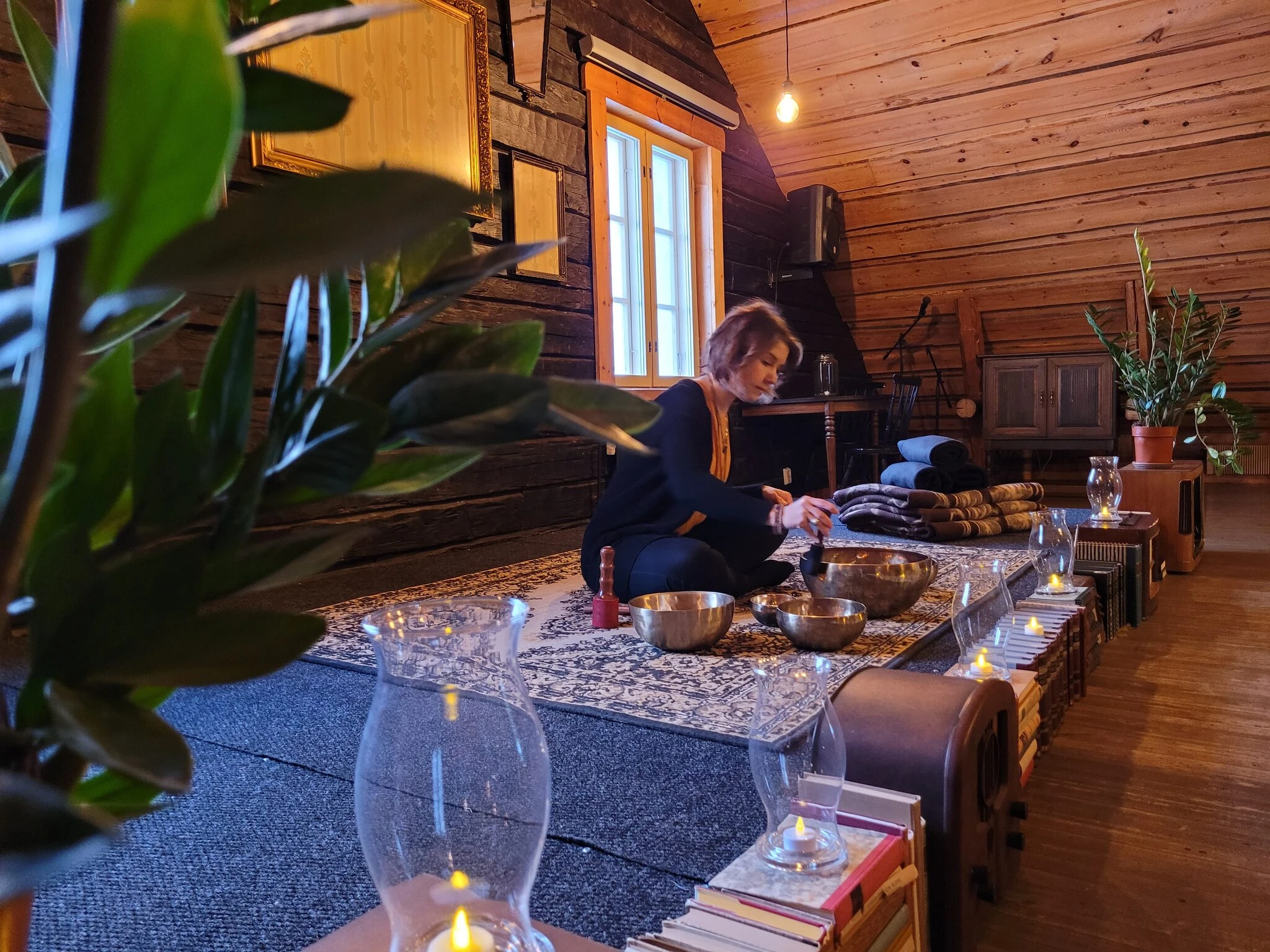 Hänen käyttämänsä tiibetiläiset käsin taotut maljat ja lempeät soittotekniikat luovat syvän rauhoittavan kokemuksen.